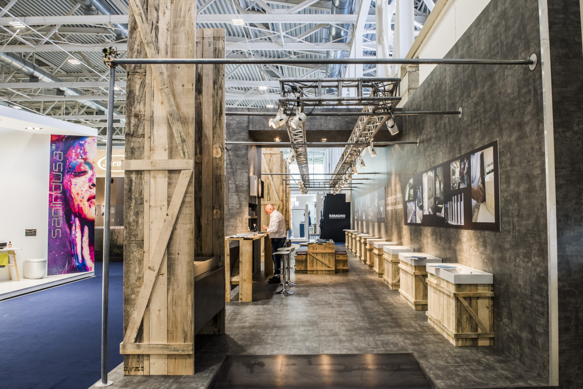 The stand structure is built around metal tubes that support large wooden crates, creating a “work in progress” or construction site effect. This innovative design recalls the idea of craftsmanship and solidity, fundamental values for Ceramica Tecla. The dominant materials are the raw wood of the cases, the metal of the structure and a dark coating, perhaps concrete or stone, for the walls. This combination of materials creates a sophisticated and masculine atmosphere, which reflects the brand’s identity.