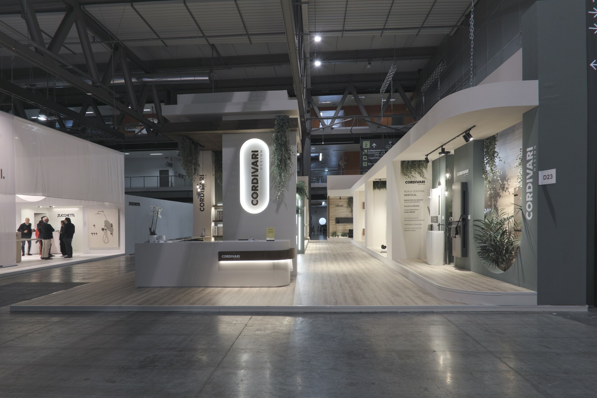 The design of the stand recreates different settings, including a spa, gym, bathroom and an outdoor with a strong green touch given by the numerous plants present. In addition to the exhibition areas, there are also two raised shopping areas and a tailor-made catering and hospitality area.