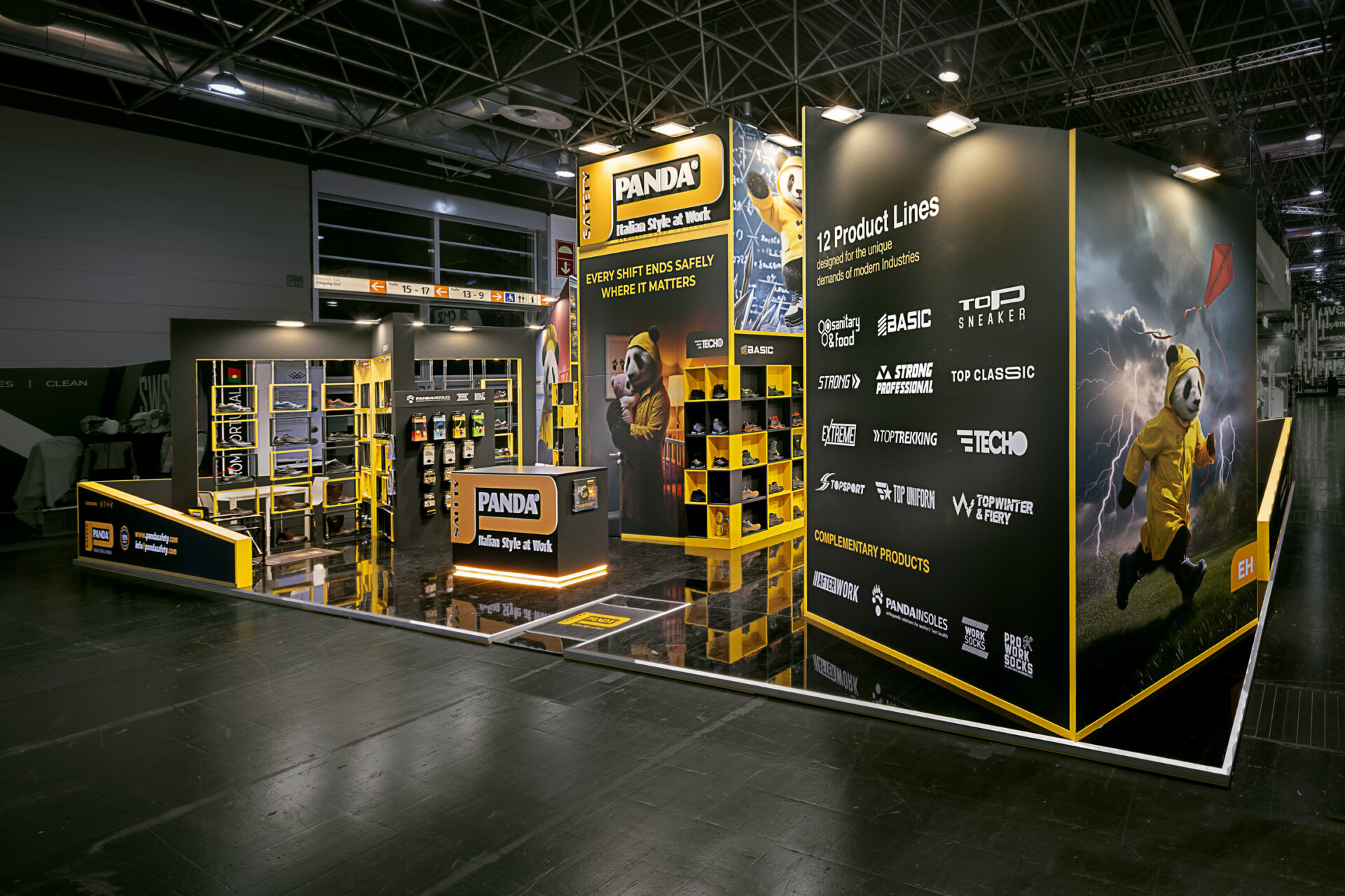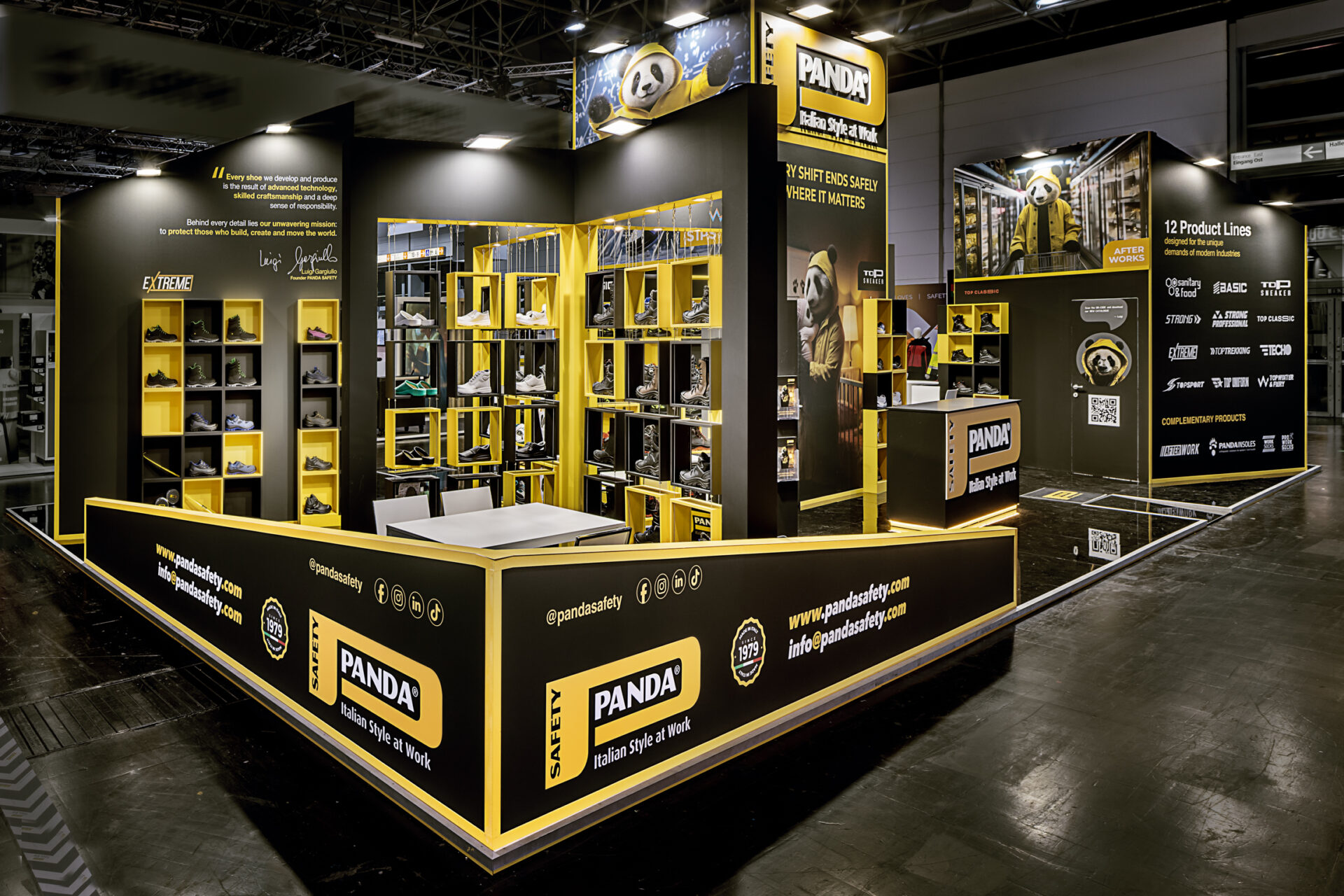 L’allestimento fiera è stato curato per offrire un’esperienza coinvolgente che bilanciasse serietà professionale e impatto visivo. La funzionalità delle scaffalature ha permesso ai professionisti di esaminare la gamma completa delle calzature antinfortunistiche in un contesto che ne esaltava il design e la qualità. Il layout dinamico e i colori forti hanno invitato a scambi proficui, rafforzando il messaggio di un brand che non scende a compromessi tra sicurezza e stile. Questo ha assicurato che il branding fieristico di Panda Safety fosse percepito come sinonimo di sicurezza hi-tech con un’anima italiana.