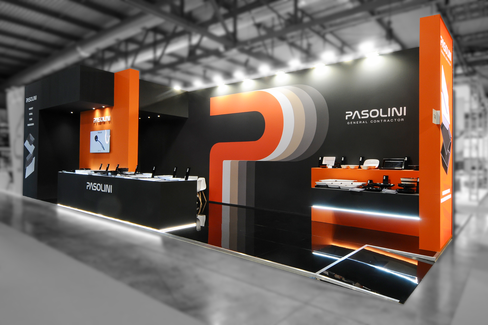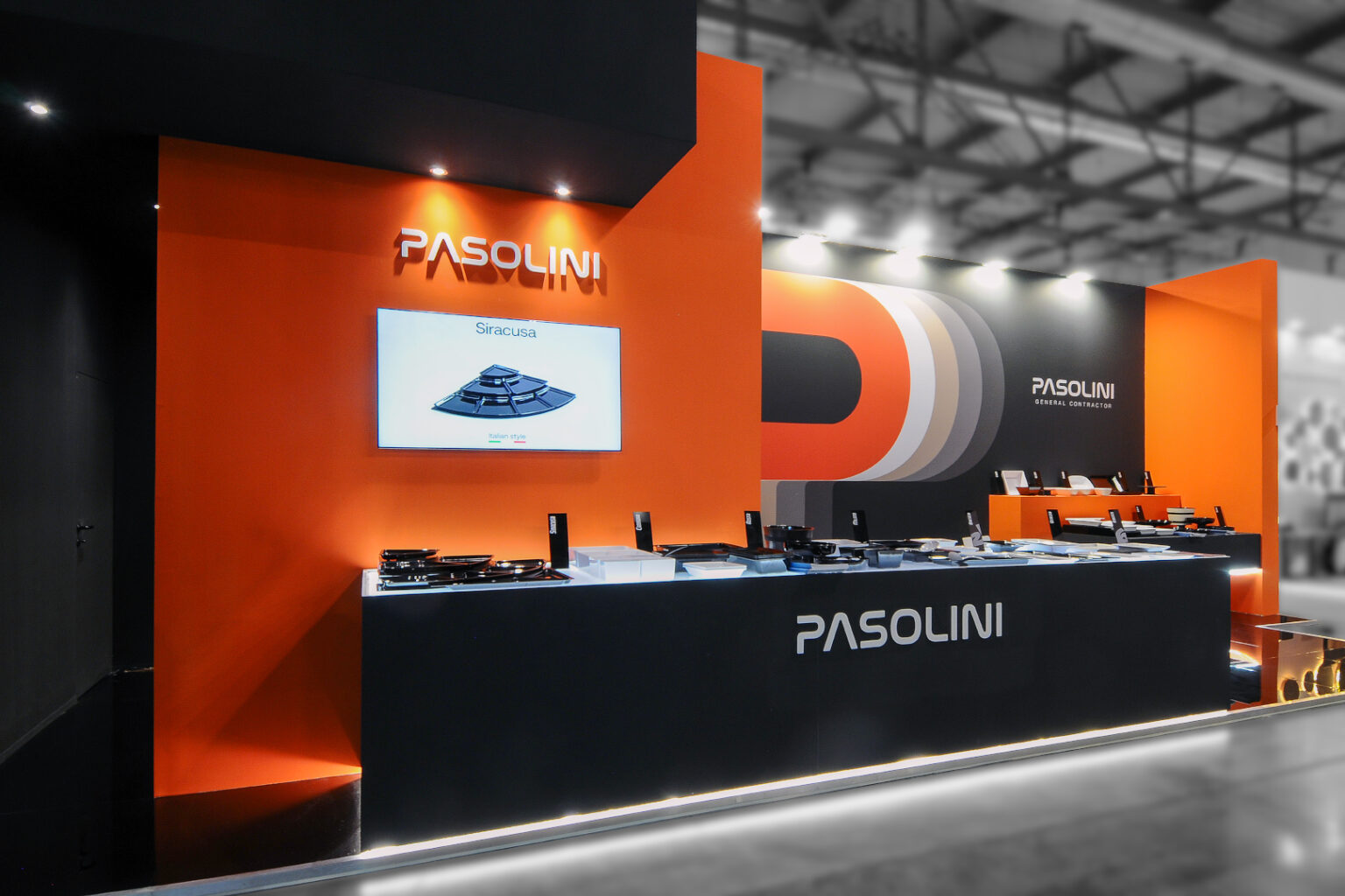 Il team di Emotiva ha affrontato la sfida di creare uno stand che riflettesse l’essenza di Pasolini: qualità del prodotto, gestione del progetto e identità visiva forte. Abbiamo optato per un design stand fieristico di forte impatto grafico, caratterizzato dal contrasto tra il nero assoluto e l’arancione brillante, colori che richiamano immediatamente l’identità del marchio.